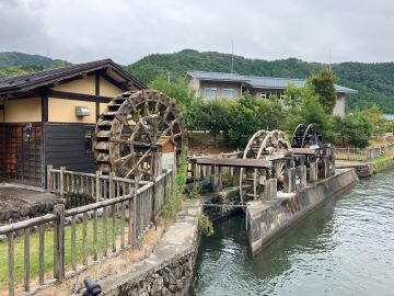 7.一乗谷あさくら水の駅:道の駅には、三連水車、後方の足羽川には屋根付きの堰、なかなかの寄り道映えスポットです。