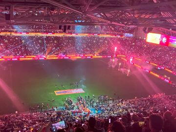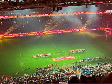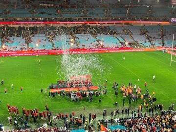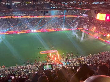 火柱が上がってセレモニー。アドバンスオーストラリアフェア(国歌)は、歌詞変更した「ワン・アンド・フリー」の部分も間違えることなく斉唱。これこ