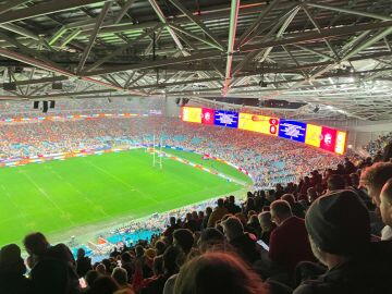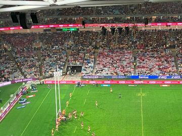 そテストマッチです。私たちは、ライオンズの赤のジャージを着て、両チームを応援します。マロ・イトジェにフィン・ラッセル、注目は、バンディー・ア キの突破力とギブソン・パークの華麗な球さばきです。ワラビーズサイドからは、ウイル・スケルトンのパワーとニック・ホワイトのひょうひょうとした動 き。前週のメルボルンでは、終了間際の逆転でライオンズの勝利。なかなか勝てないワラビーズが、雨の中、一矢報いるか。 ![]() ![]()