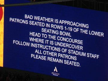 るというアクシデントで、ラインアウトやスクラムに影響が出るのではと心配していたら、集中豪雨。選手退場、観客席前方の人達も退場。なんと、 雷の雲が近づいてる関係で、試合中断になりました。テストマッチの中断なんて初めての体験で、中止にならなかっただけでも、ありがたいと考え るべきでしょうか。 ![]()
