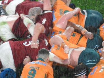 激しい雨の中、後半スタートです。ライオンズのもう一人のロック、ジェームズ・ライアンが気を失って担架で退場。ライオンズの両ロックが居なくな